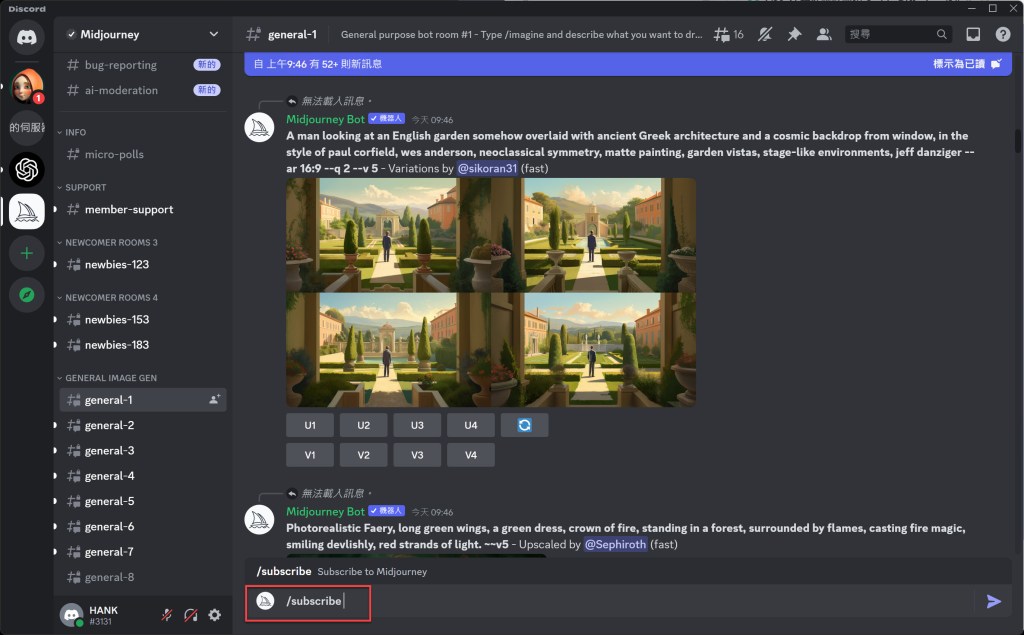 訂購完成就可以回到 Discord 開始使用 Midjournet 產圖