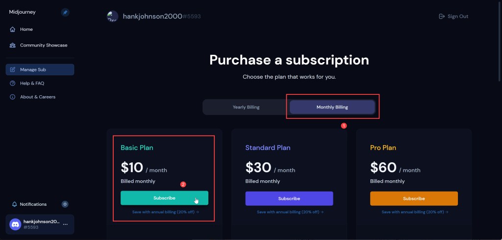 如果不想繼續使用 Midjourney,需要手動去取消訂購。否則每個月都收到 10 美元的自動繼續訂購的費用,取消的方法如下: