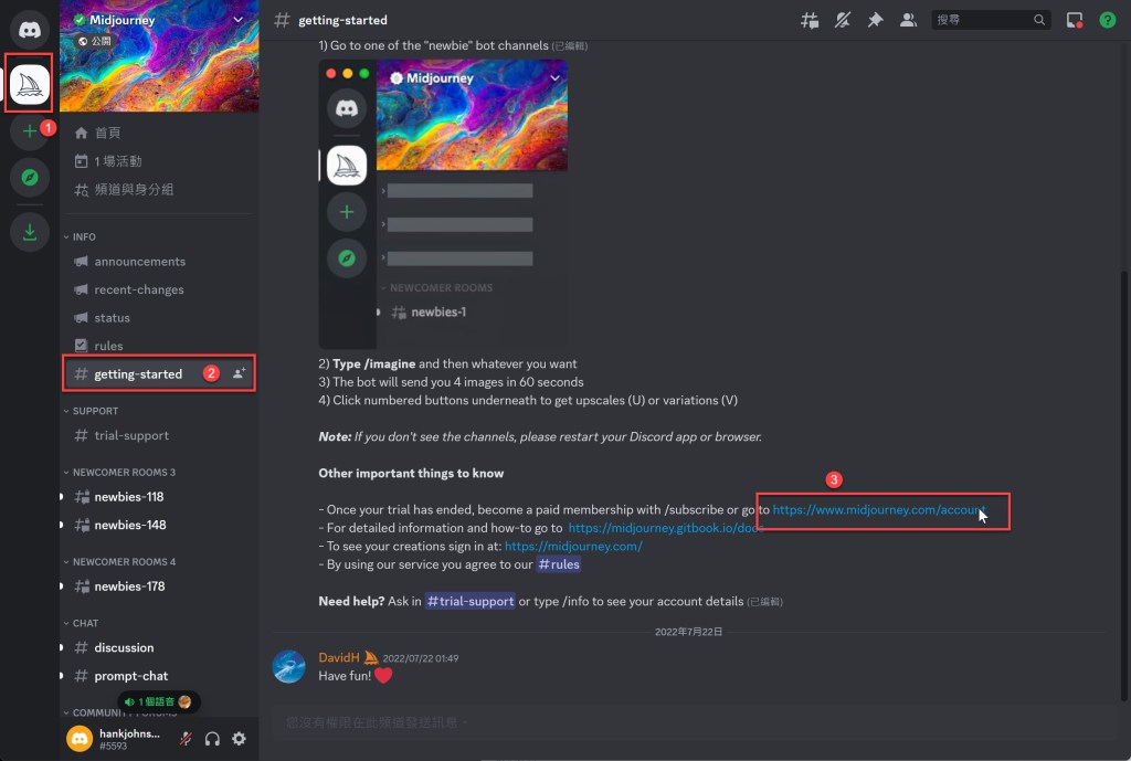 1. 第一次進入 Midjourney 請到 # getting-started 頁籤,然後選擇 goto https://www.midjourney.com/account/
